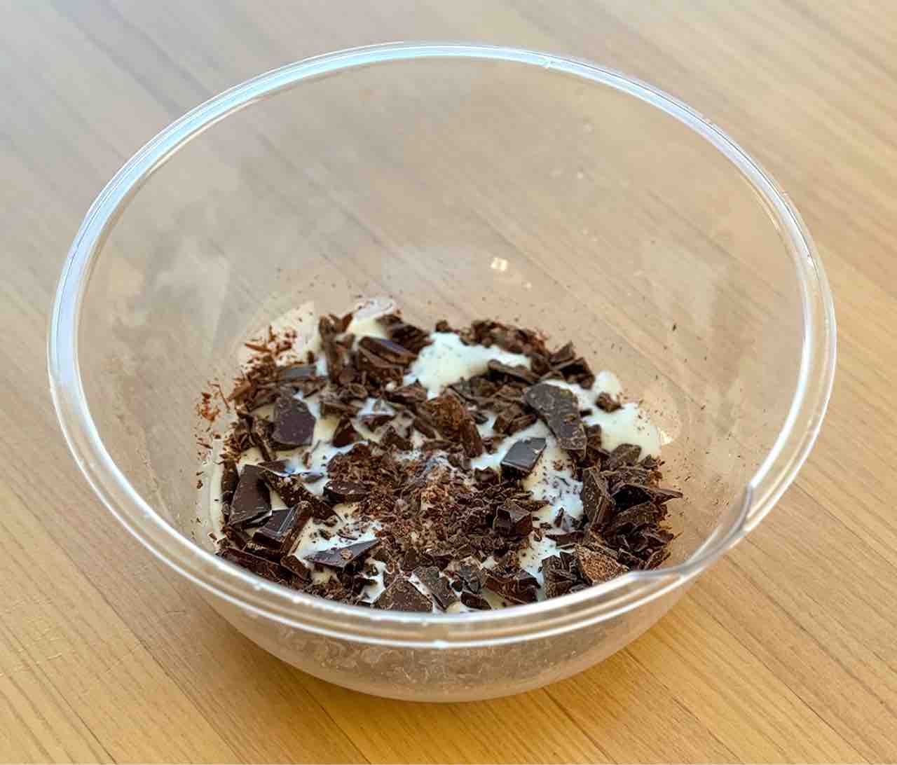1.耐熱ボウルにチョコと牛乳を入れ、600Wのレンジで1分30秒加熱し、混ぜて溶かす。
