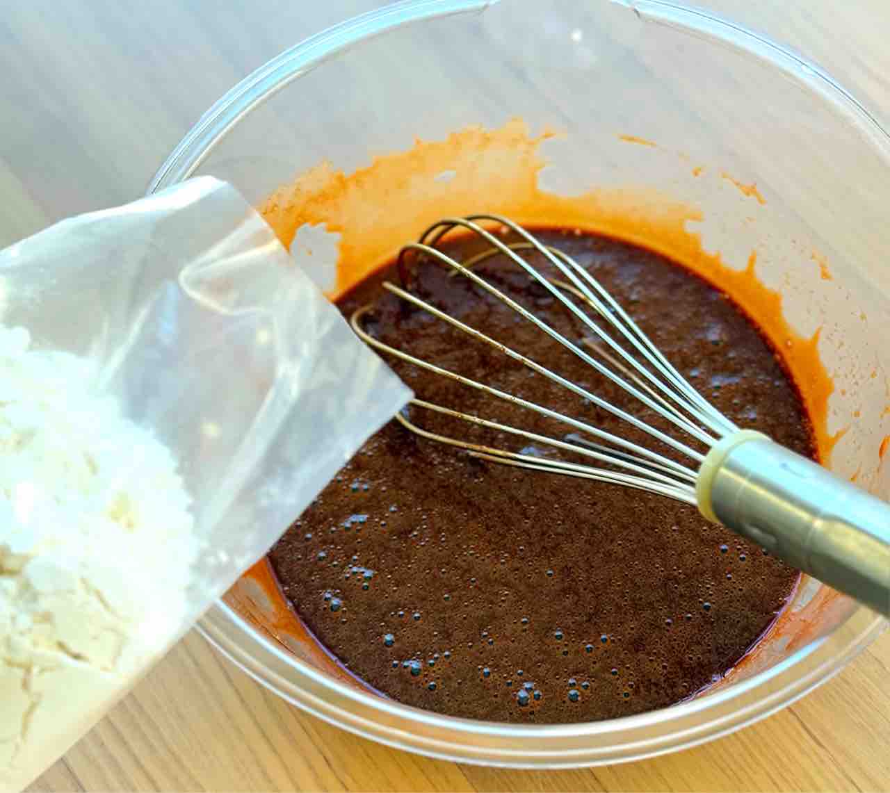 ♦︎溶かしたチョコレートが冷えかたまらないうちに手早く生地を作ります!不安な方は湯煎にかけて作業してもOKです♩