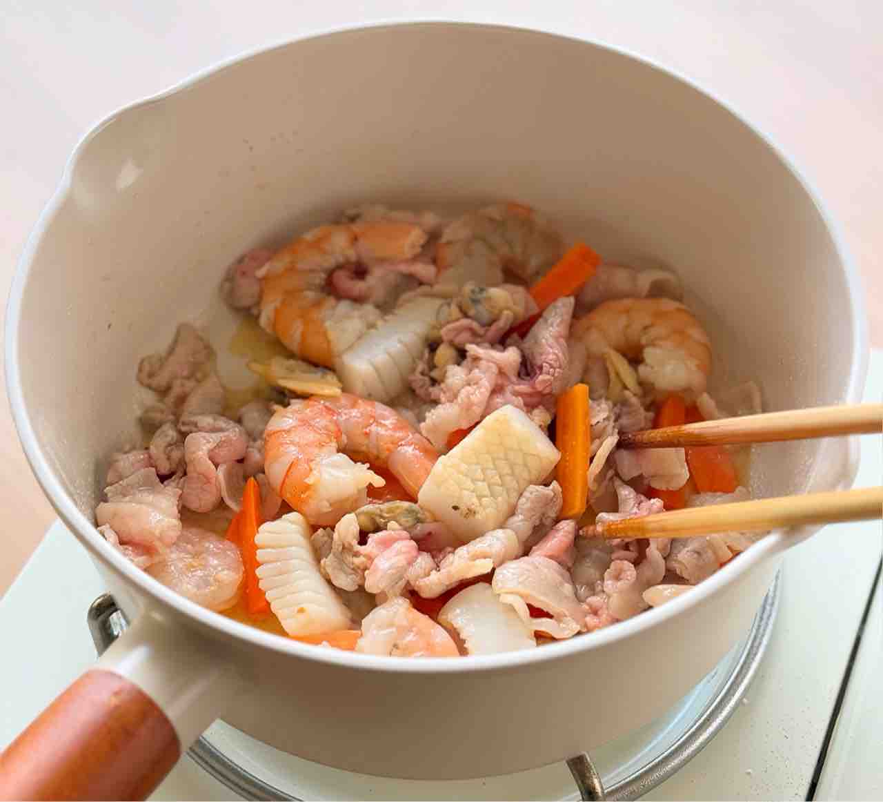 2.鍋にごま油を中火で熱し、豚肉、シーフードミックス、にんじんを炒める。肉の色が変わったらキャベツ、かまぼこ、もやしも加えて2分ほど炒める。