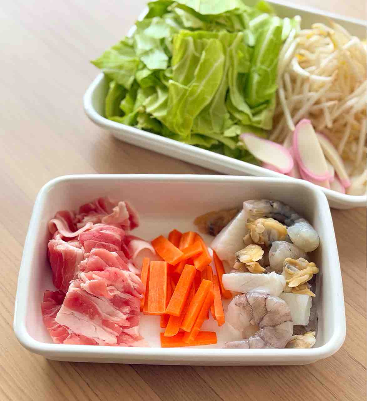 1.豚肉は3cm長さに切る。シーフードミックスはさっと洗って水気を切る。にんじんは短冊切り、キャベツはざく切り、かまぼこは薄切りにする。