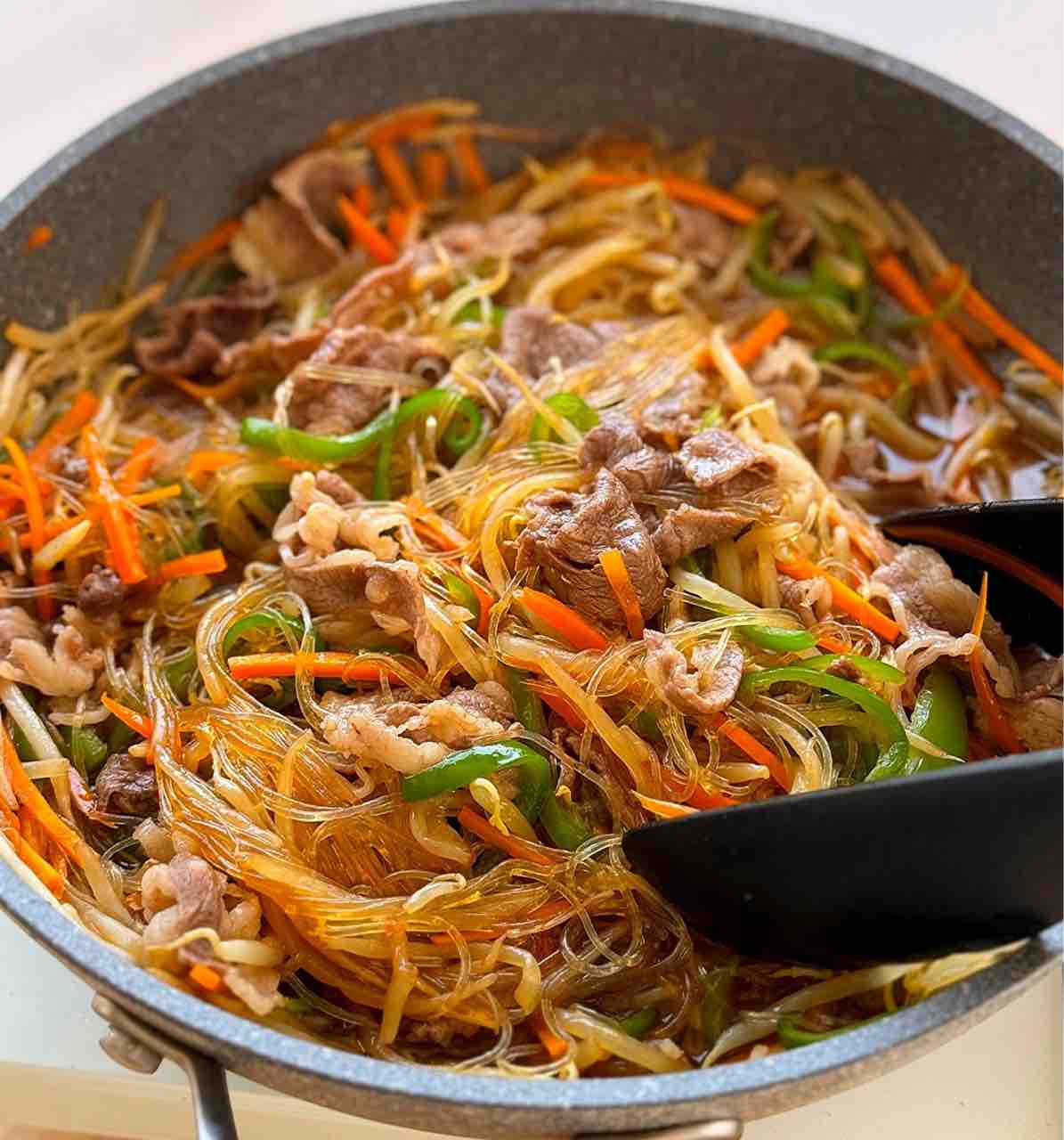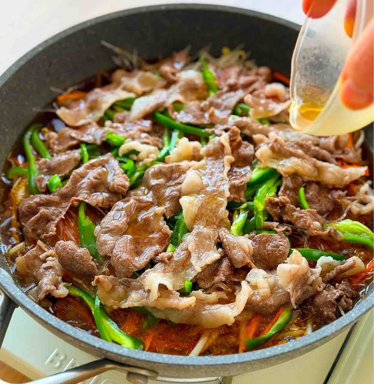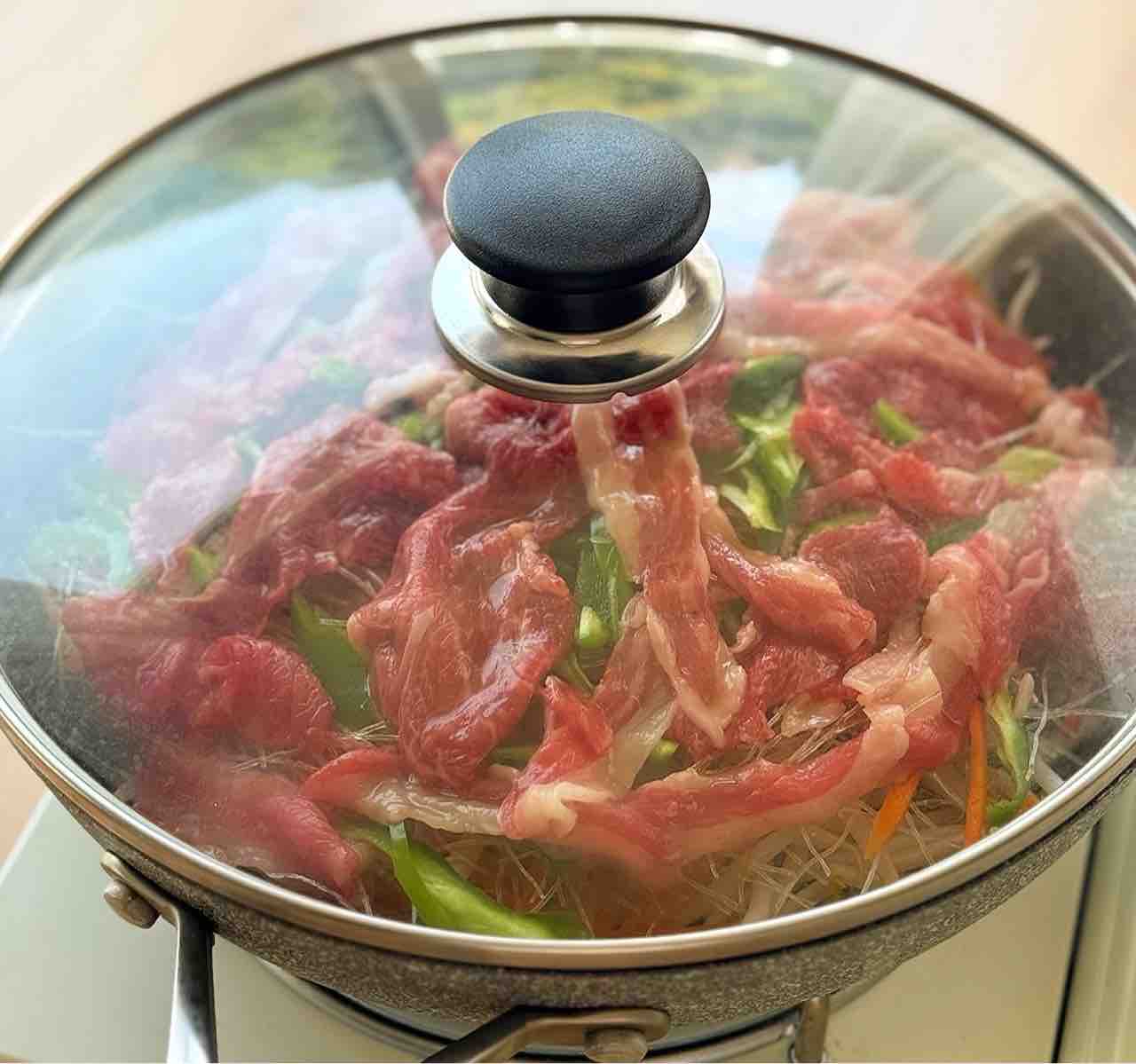 2.フライパンにもやし→にんじん→春雨(乾燥のまま)→ピーマン→肉の順に広げて重ね、⚫︎をまわしかける。蓋をして中火にかけ、8分蒸し焼きにする。