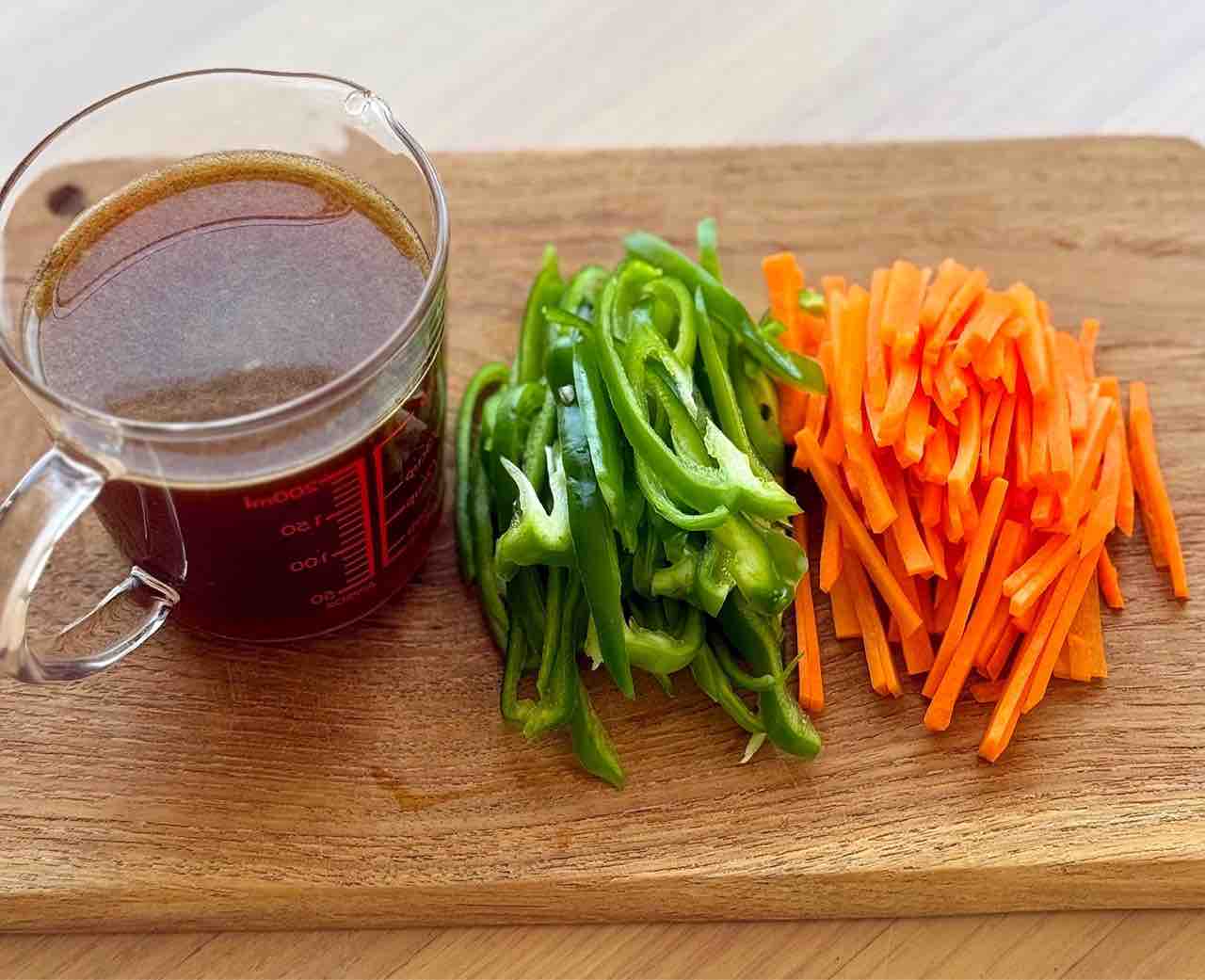 1.ピーマンとにんじんは細切りにする。⚫︎は合わせておく。