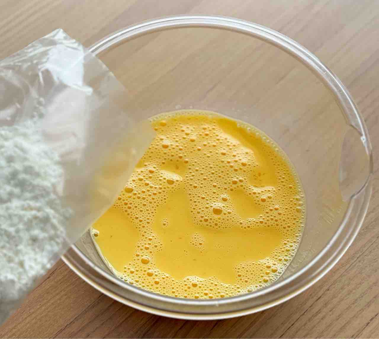 2.ボウルに卵と牛乳を入れて混ぜ、ホットケーキミックスも加えて混ぜる。