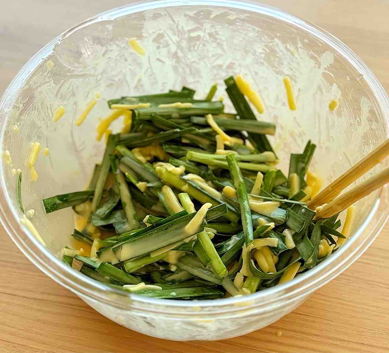 1.ニラは4cm長さに切る。ボウルに●を入れて混ぜ、ニラとピザ用チーズを加えて混ぜる。