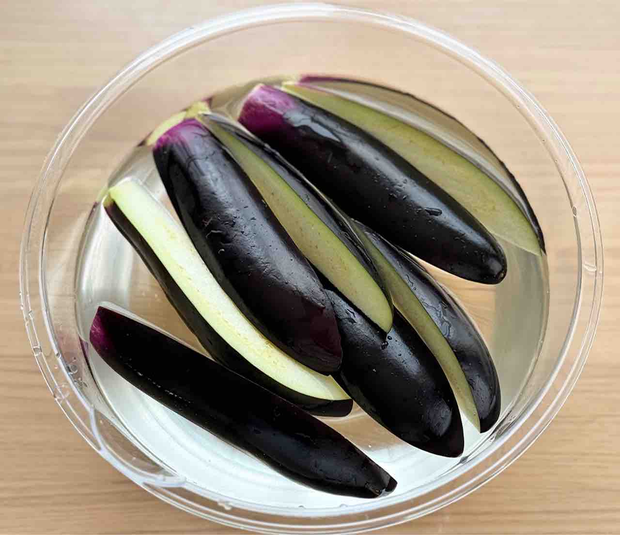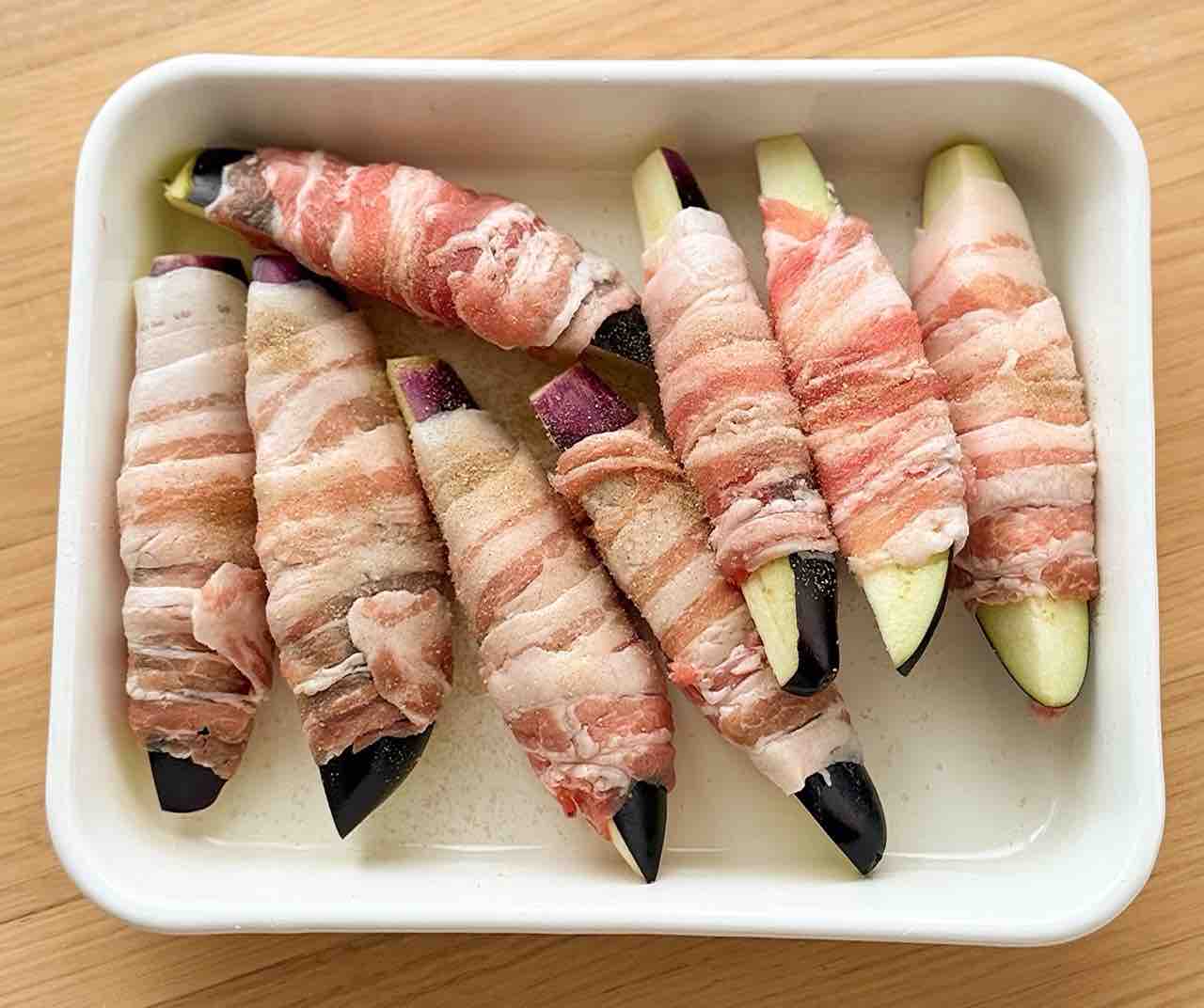 1. なすは縦4等分に切り、水に晒してアク抜きし、水気を切る。なすに豚肉を一枚ずつ巻き付け、塩こしょうを振る。