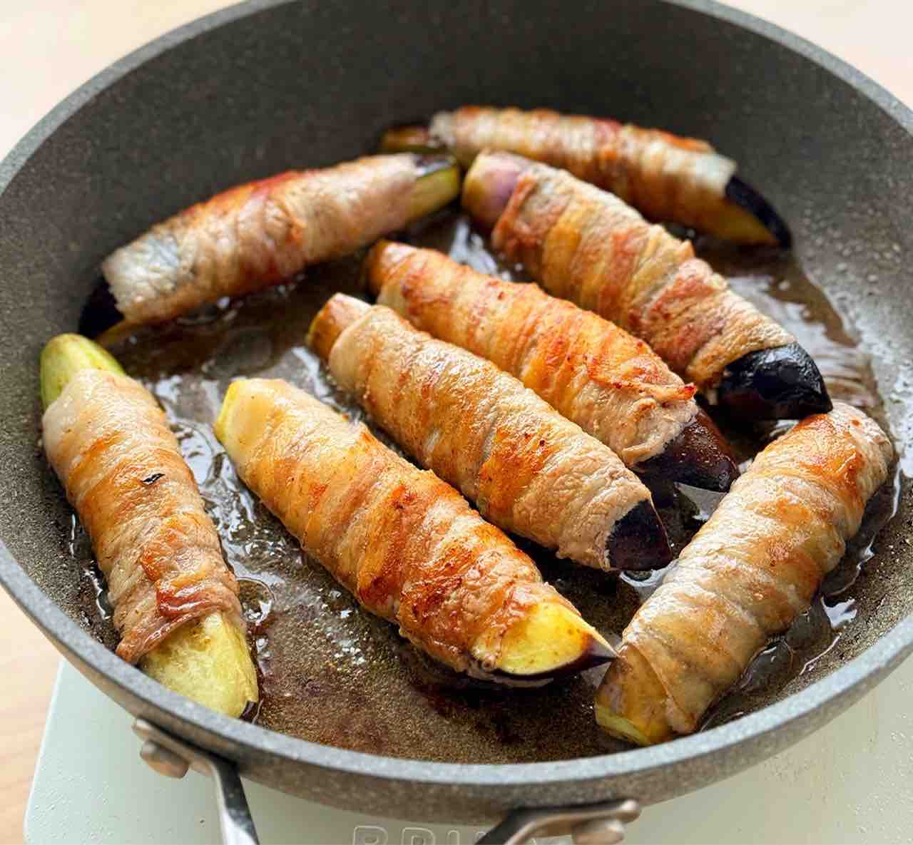 ♦︎なすの水気はしっかり切ってから(余裕があれば拭いて)豚肉をしっかりきつめに巻いて下さい♩