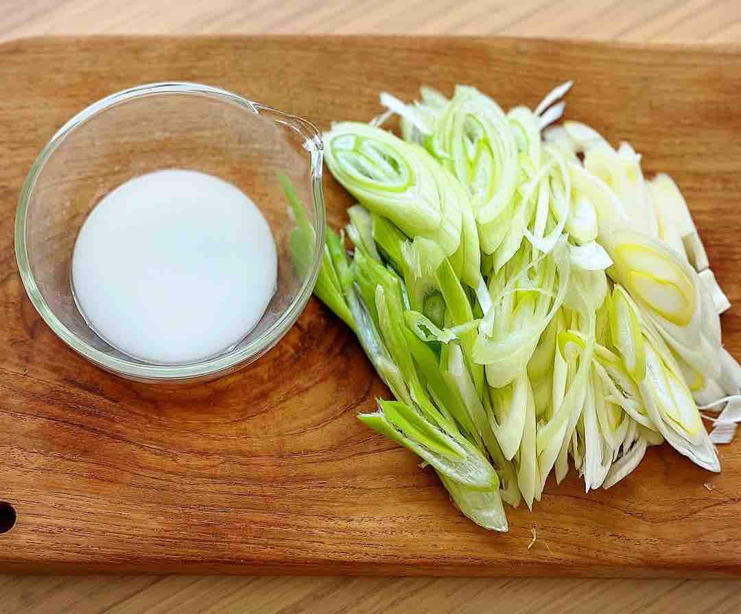 1.長ねぎは斜め薄切りにする。片栗粉は水大1.5(分量外)で溶く。
