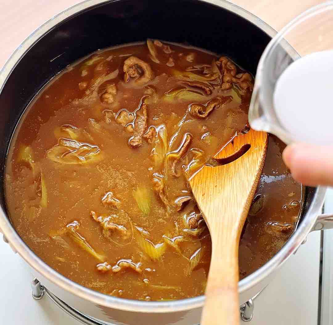 3.弱火にし、ルーを加えて溶かし、最後に水溶き片栗粉を加えてとろみを付ける。