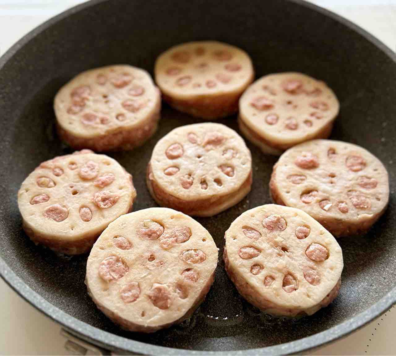 ♦︎工程2では肉だねがれんこんの穴からはみ出すようにぎゅっと押さえて下さい♩焼く前に水で濡らした手で周囲の形を整えておくと綺麗に仕上がります♩