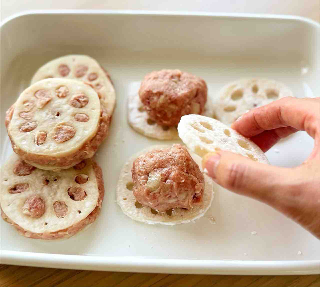 2.れんこんを2枚1組にして肉だねを挟み、ぎゅっと押さえて密着させる。(※れんこんの穴から肉だねがはみ出るくらいぎゅっと押さえて密着させます)