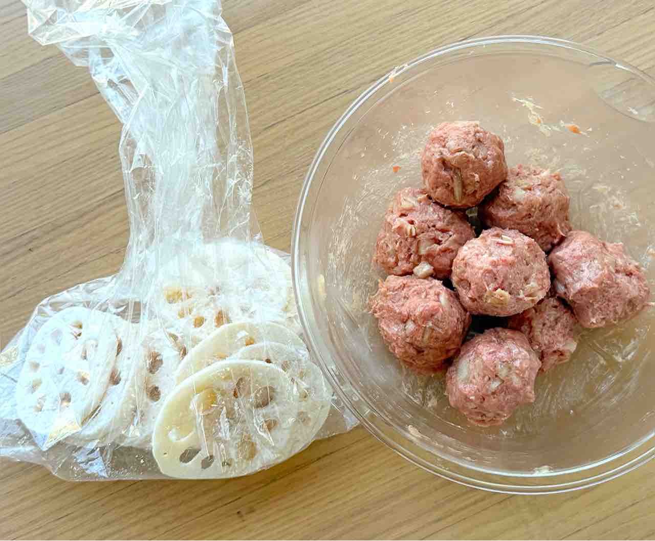 1.ボウルに●を入れてよく混ぜ、8等分して丸める(肉だね)。れんこんは5mm幅の輪切り(計16枚)にしてポリ袋に入れ、片栗粉を加えて振ってまぶす。