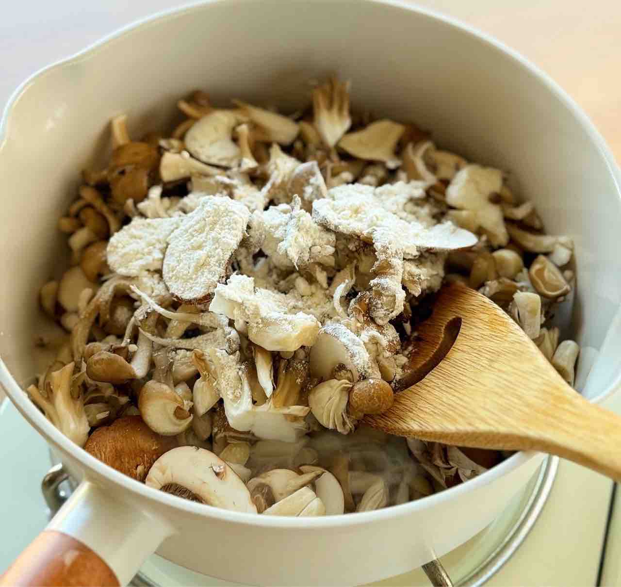 ♦︎薄力粉はきのこの上に振りかけるようにしてください♩