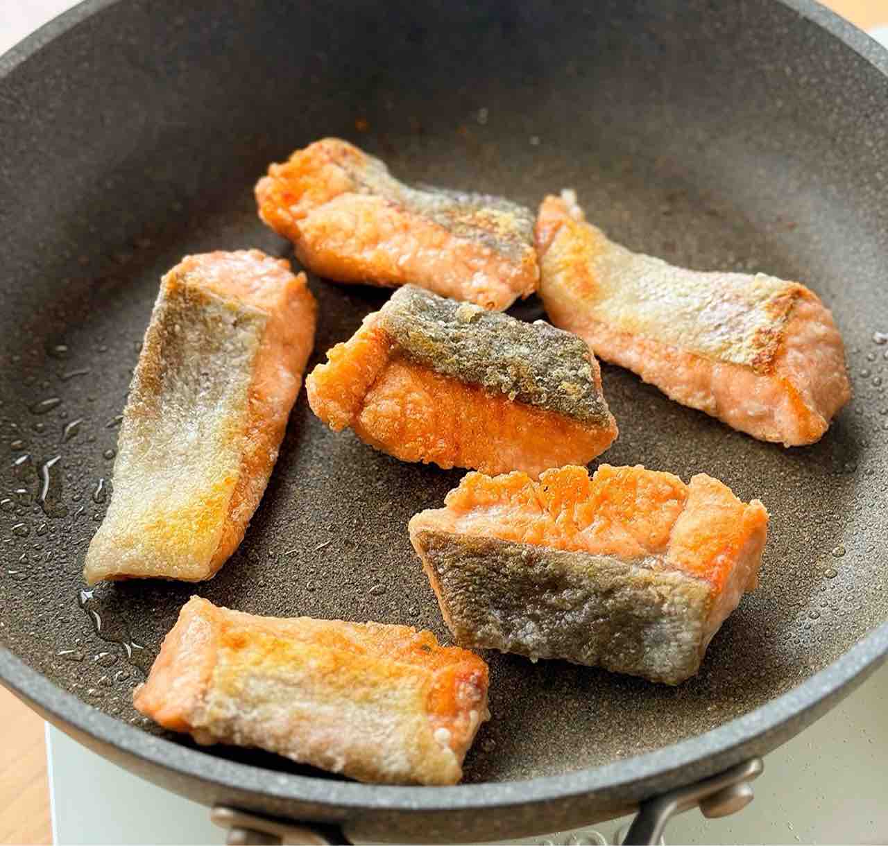 2.フライパンに油を中火で熱し、鮭を両面色よく焼いて器に盛る。
