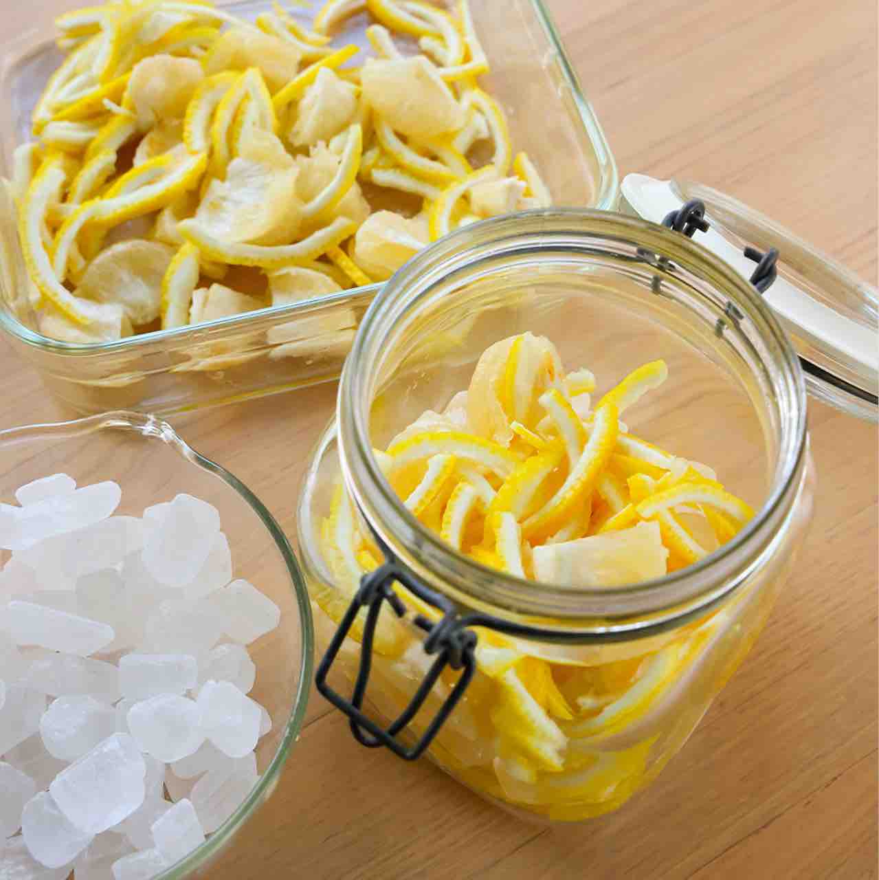 1. ゆずのへたを取って流水で洗い、水気を拭いて皮を剥く。