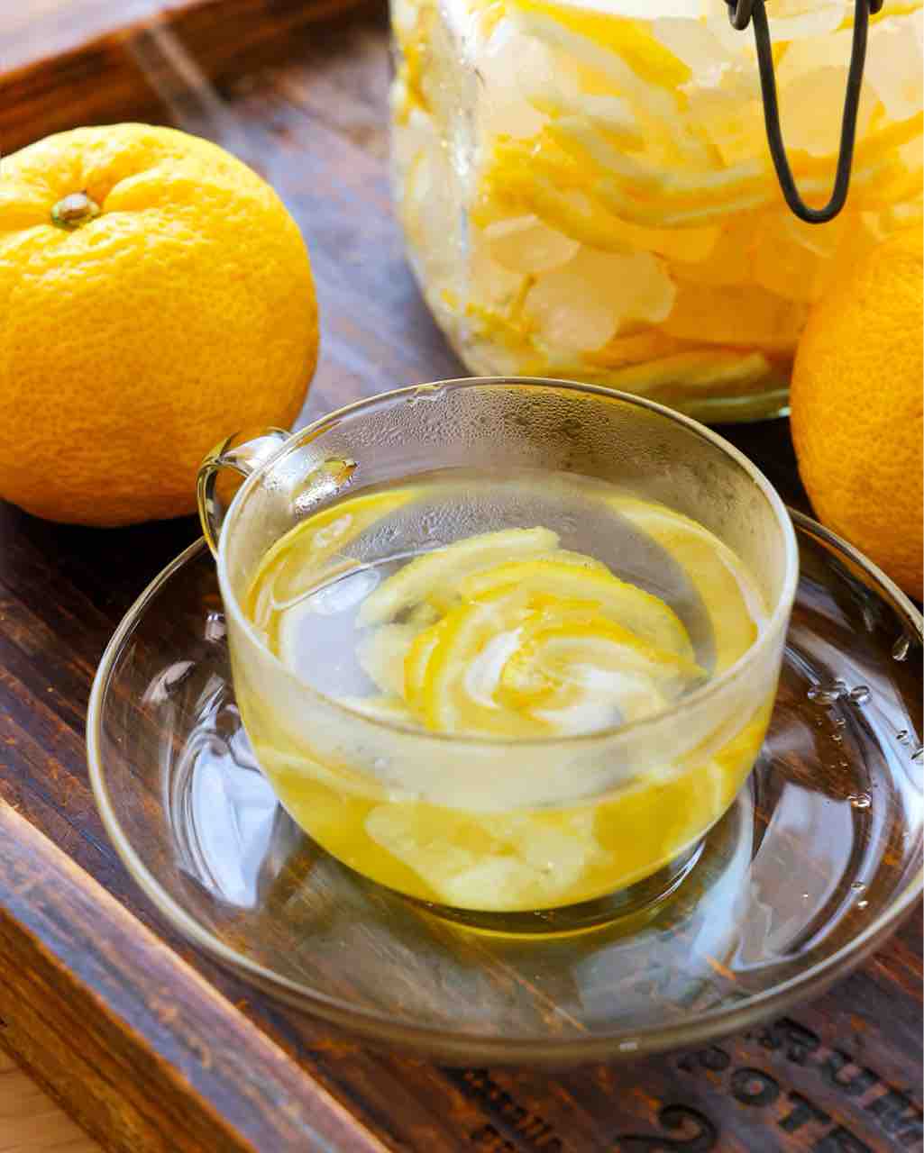 5.約1週間でゆずシロップのできあがり!3~5倍のお湯で割ったり、ヨーグルトにかけて召し上がれ。