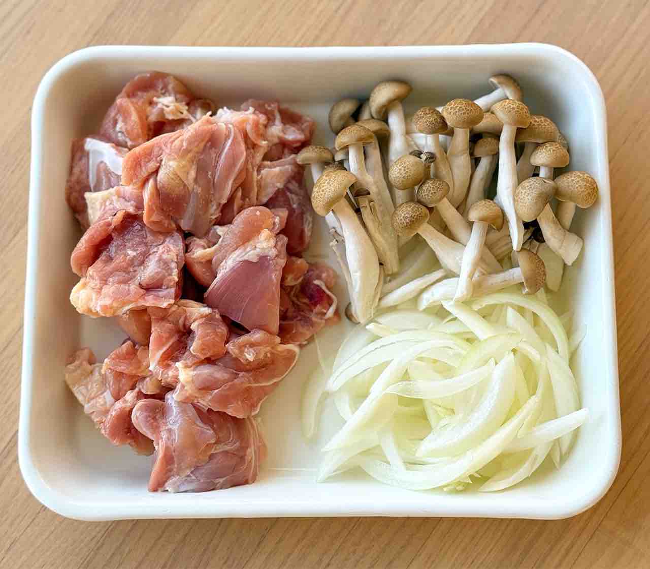 1.鶏肉は3cm大に切る。玉ねぎは薄切りにする。しめじはほぐす。