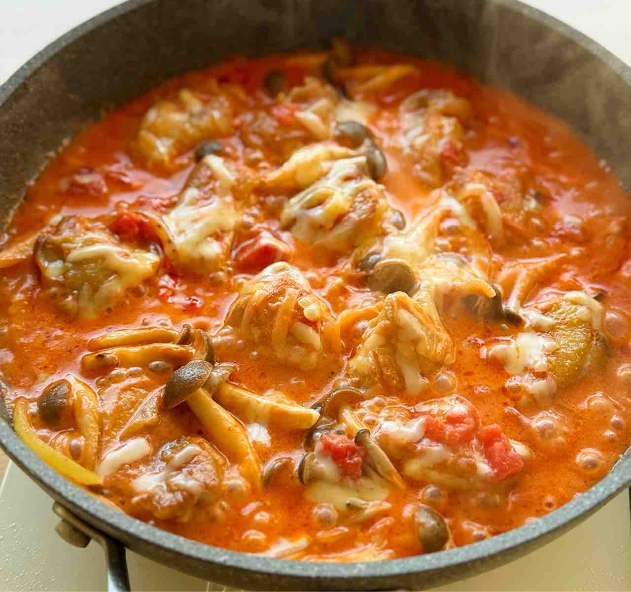 3.⚫︎を加えて3〜4分煮込み、火が通ったらチーズを加えてとろけるまで加熱する。器に盛ってパセリを振る。