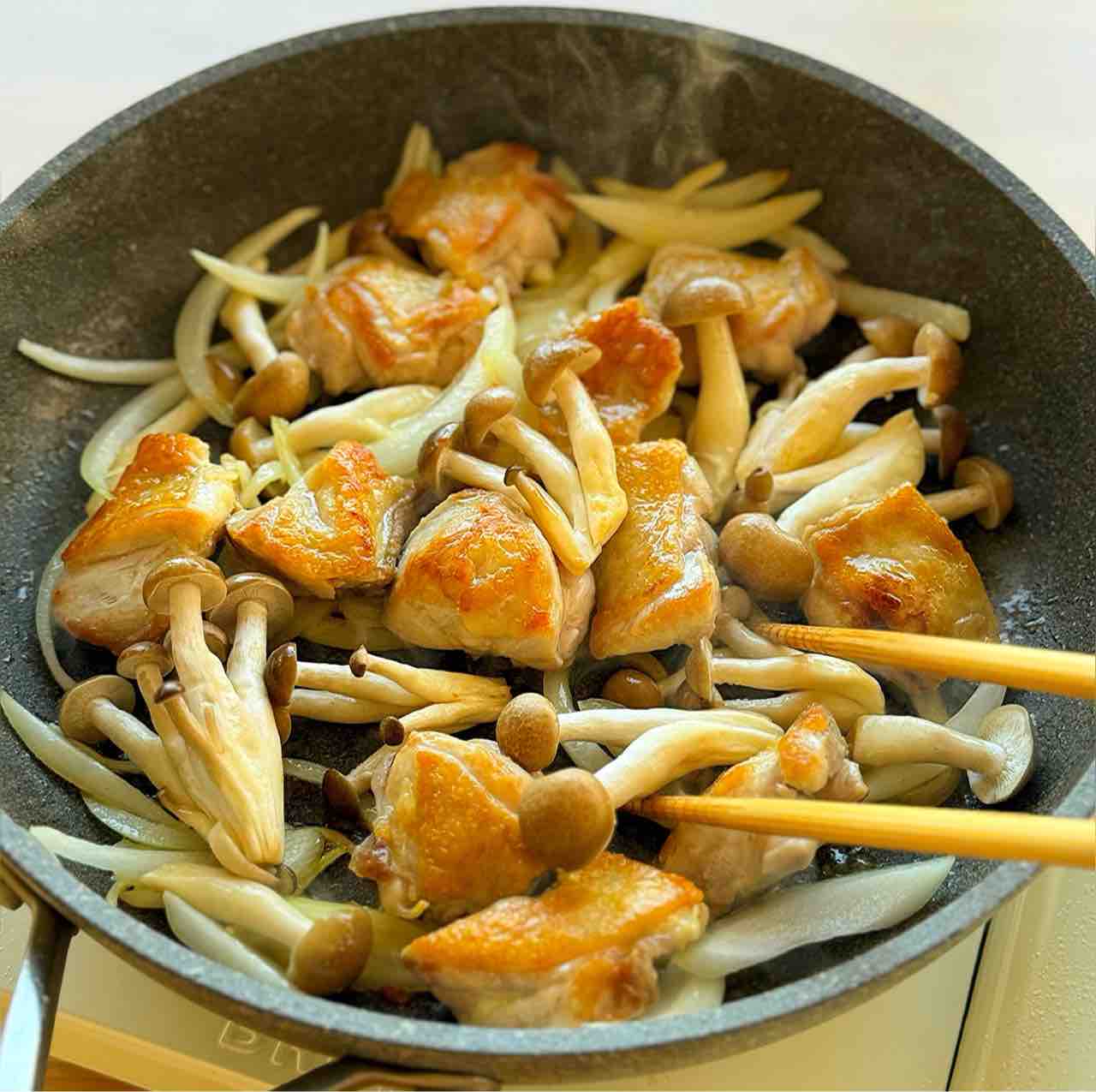 2.フライパンにオリーブ油を中火で熱し、鶏肉を両面しっかり焼き色が付くまで焼く。玉ねぎとしめじを加えてさっと炒める。