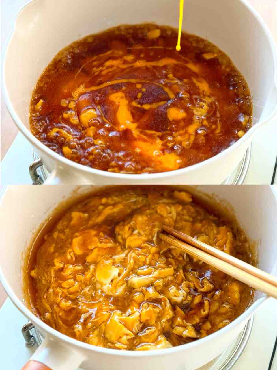 3.溶き卵をまわし入れ、大きくひと混ぜする。卵がふんわりしたら1にかける。
