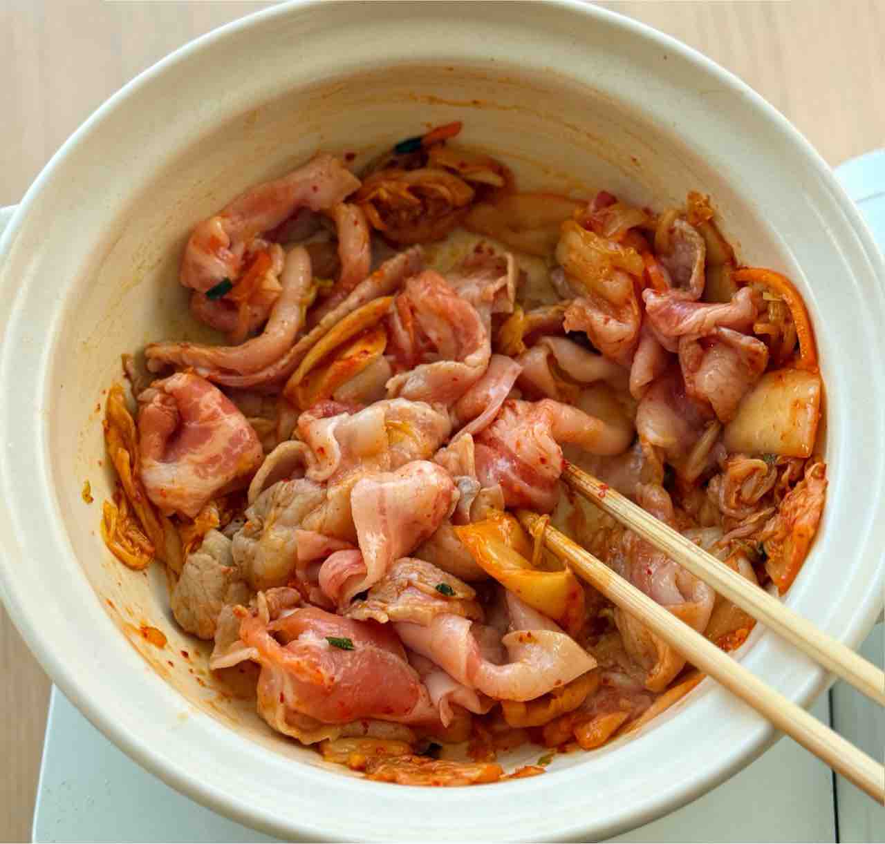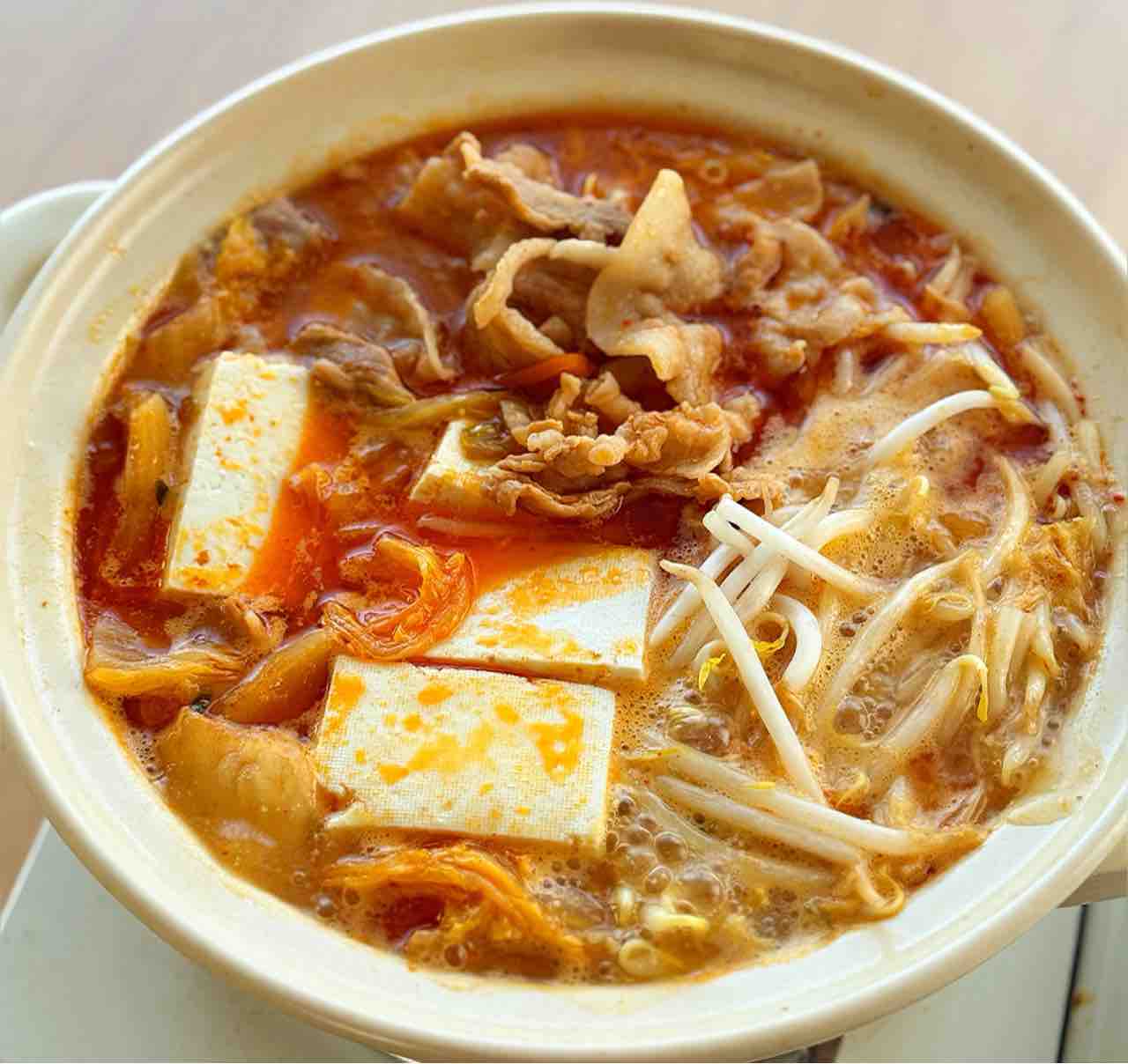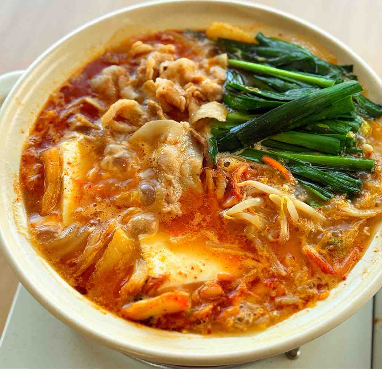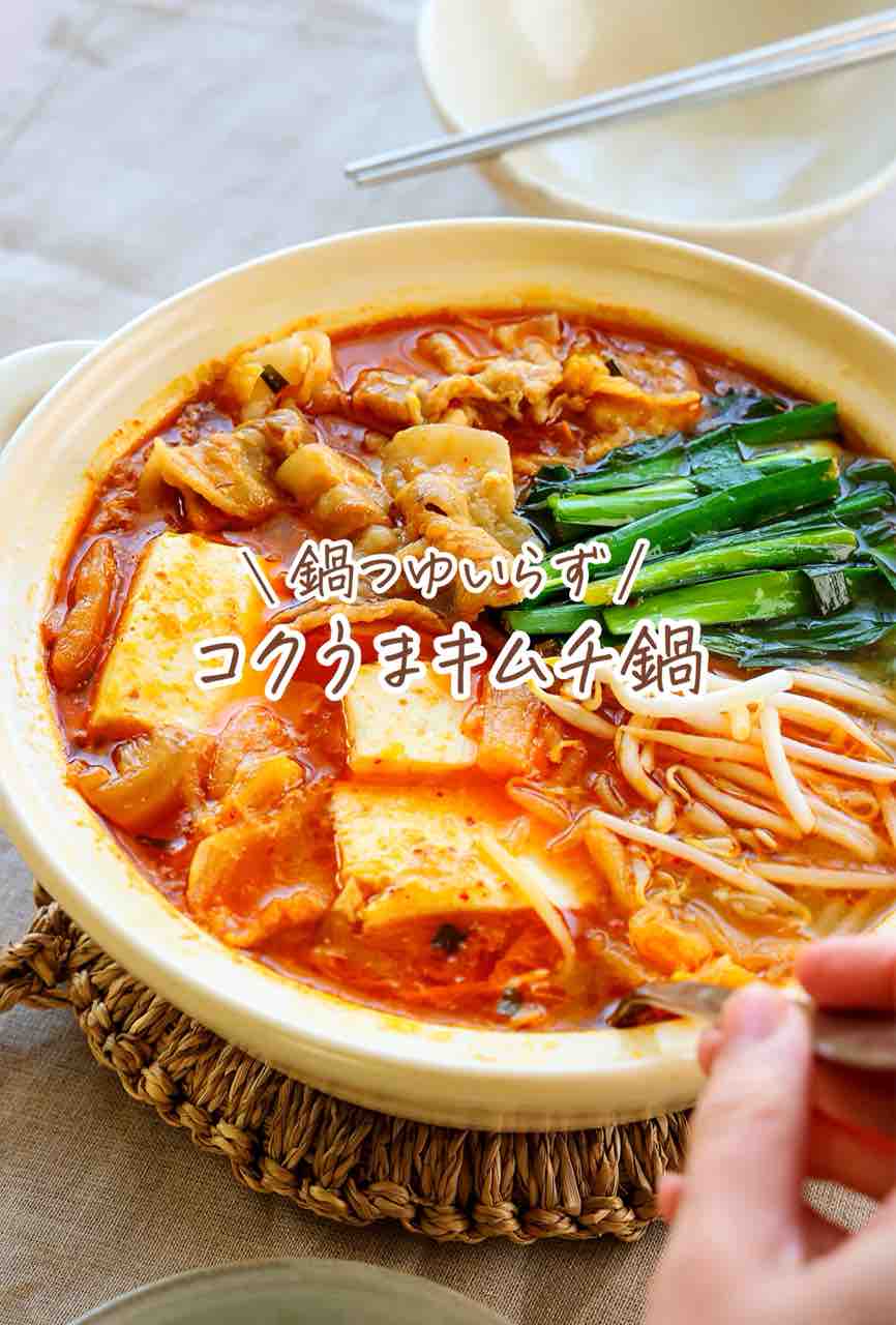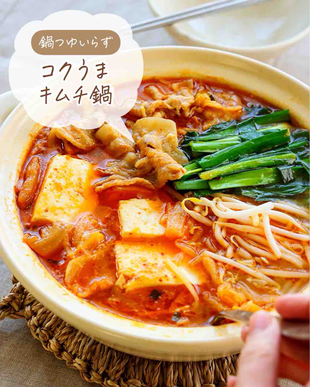 2.鍋にごま油を中火で熱し、豚肉とキムチを炒める。肉の色が変わったら⚫︎を加え、煮立ったらもやしと豆腐を加えて5分煮る。