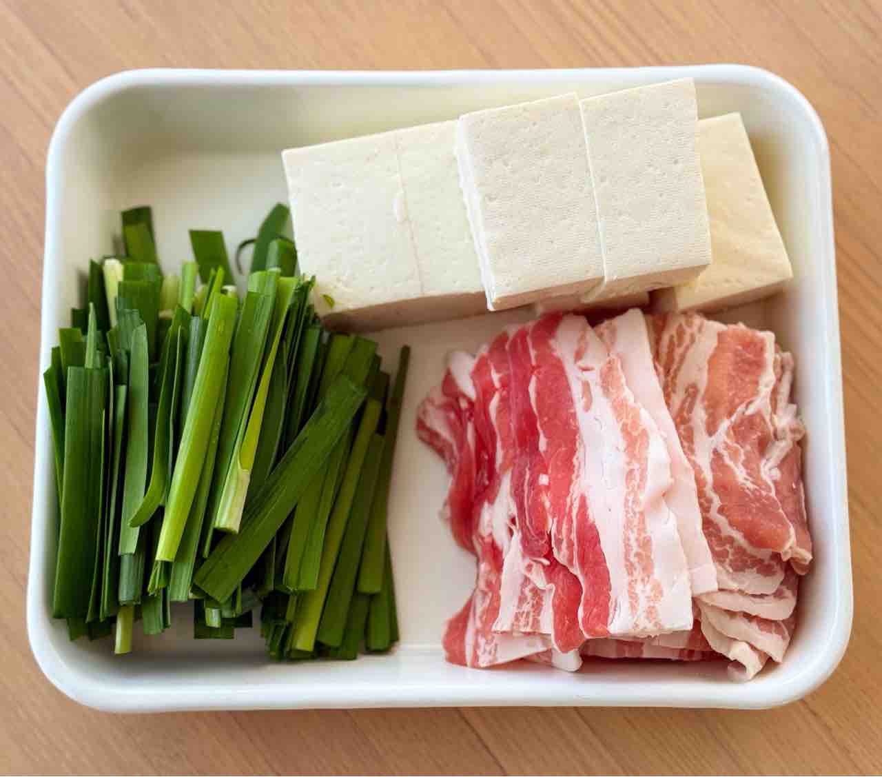 1.豚肉とニラは4〜5cm長さに切る。豆腐は食べやすい大きさに切る。