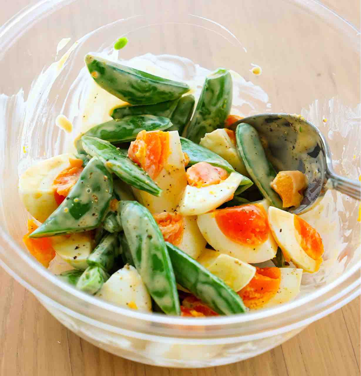 1.スナップえんどうはヘタと筋を取る。塩(分量外)を加えた熱湯で1〜2分茹で、冷水で冷やして斜め半分に切る。ゆで卵は一口大に切る。