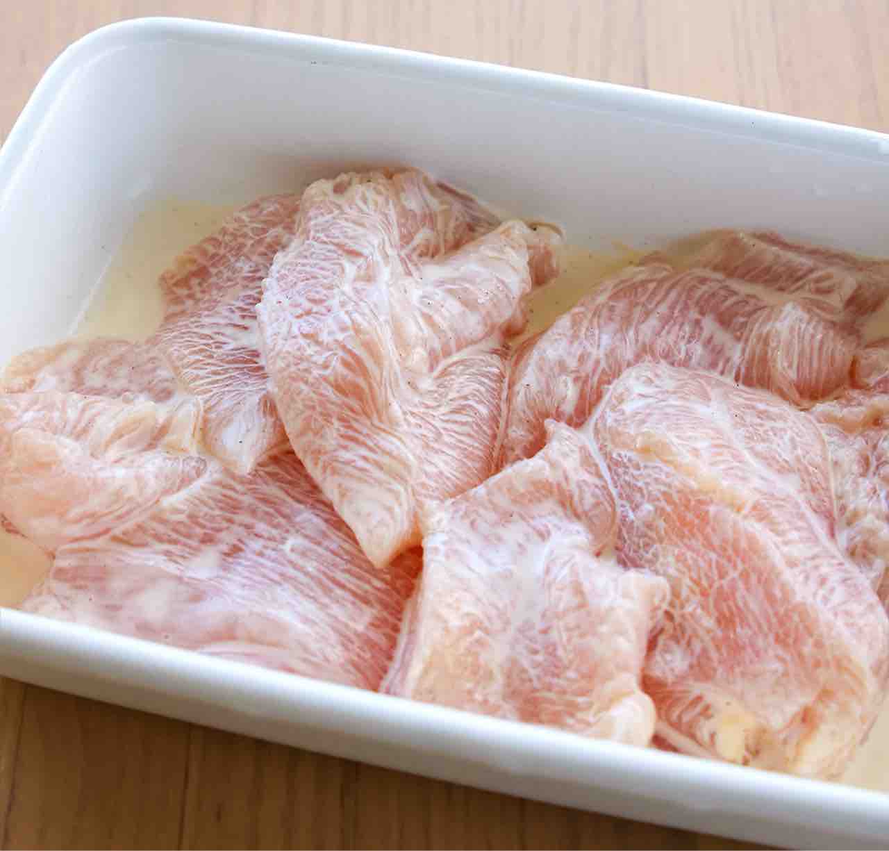 1.鶏肉は8等分の削ぎ切りにして⚫︎をもみ込む。