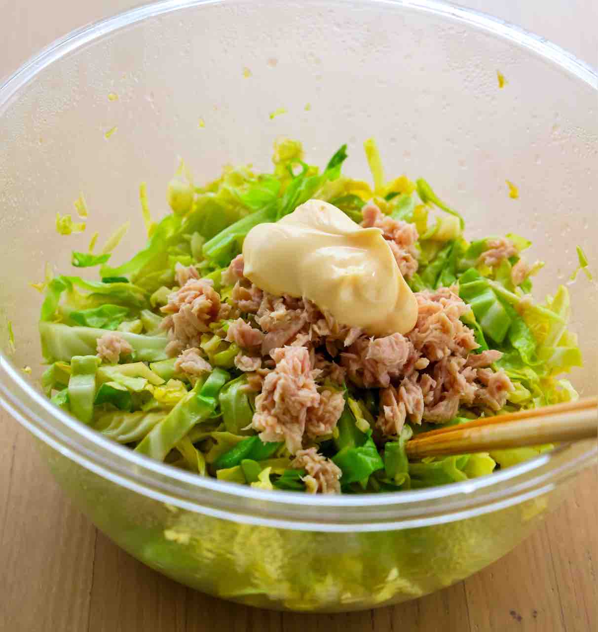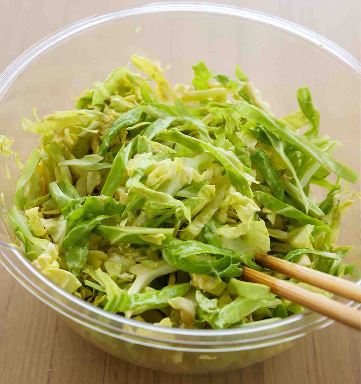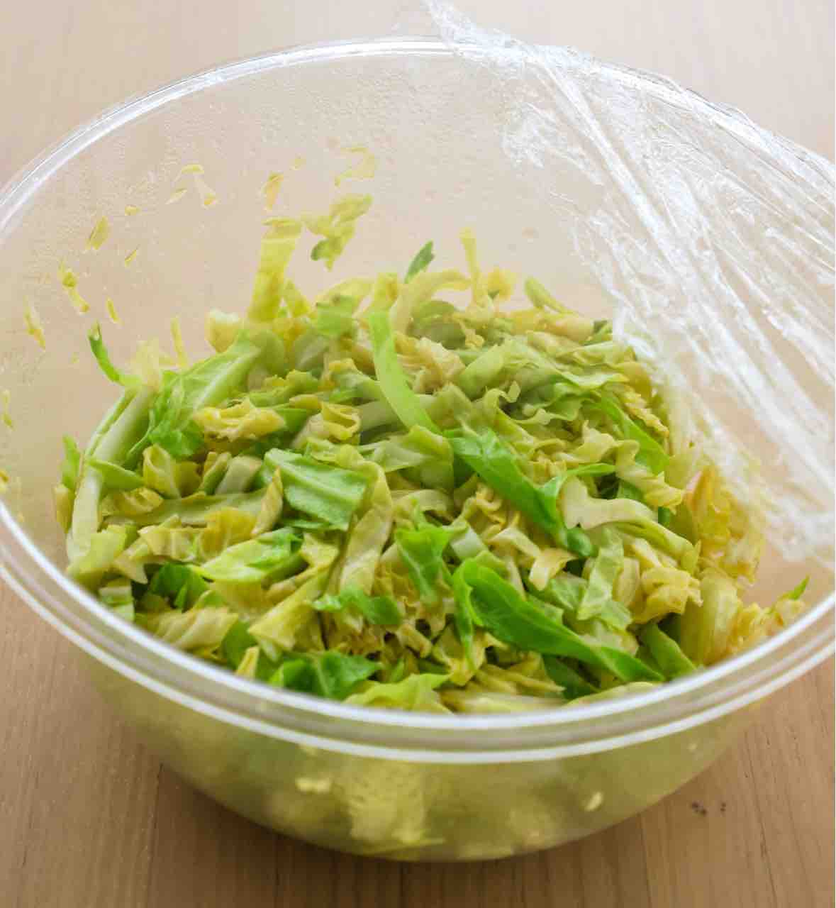 1.キャベツは太めの千切りにして耐熱ボウルに入れ、⚫︎を混ぜる。ふんわりラップをかけ、600Wのレンジで3分加熱する。