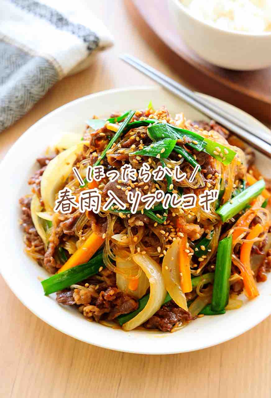 2.フライパンに春雨→玉ねぎ→にんじん→牛肉→ニラの順に重ね入れ、水を注ぐ。
