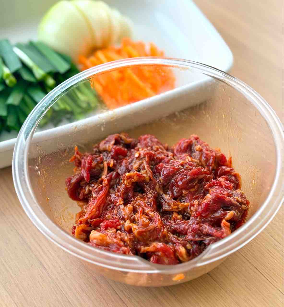 1.牛肉に⚫︎をもみ込む。玉ねぎは1cm幅に切る。にんじんは細切りにする。ニラは4cm長さに切る。