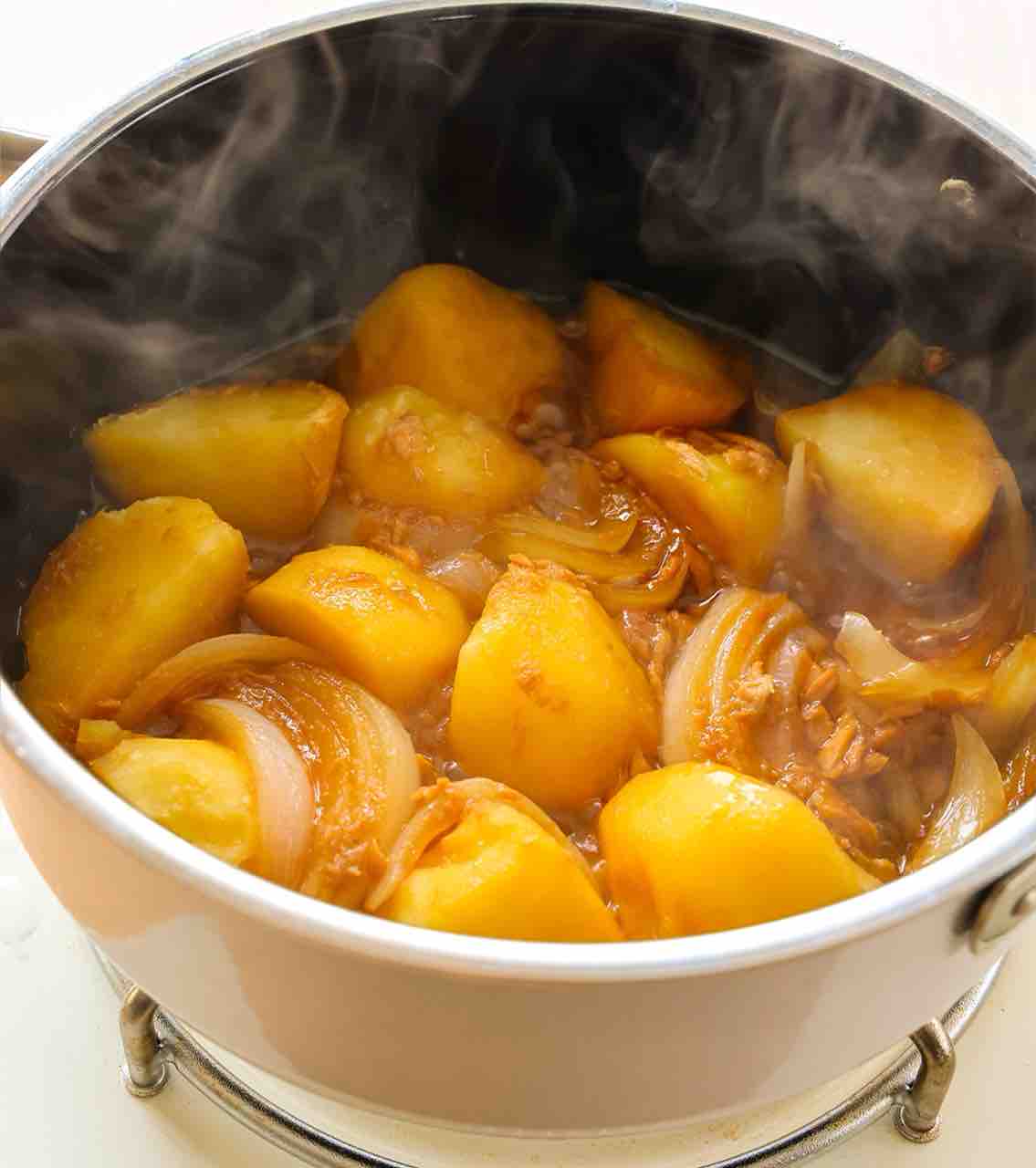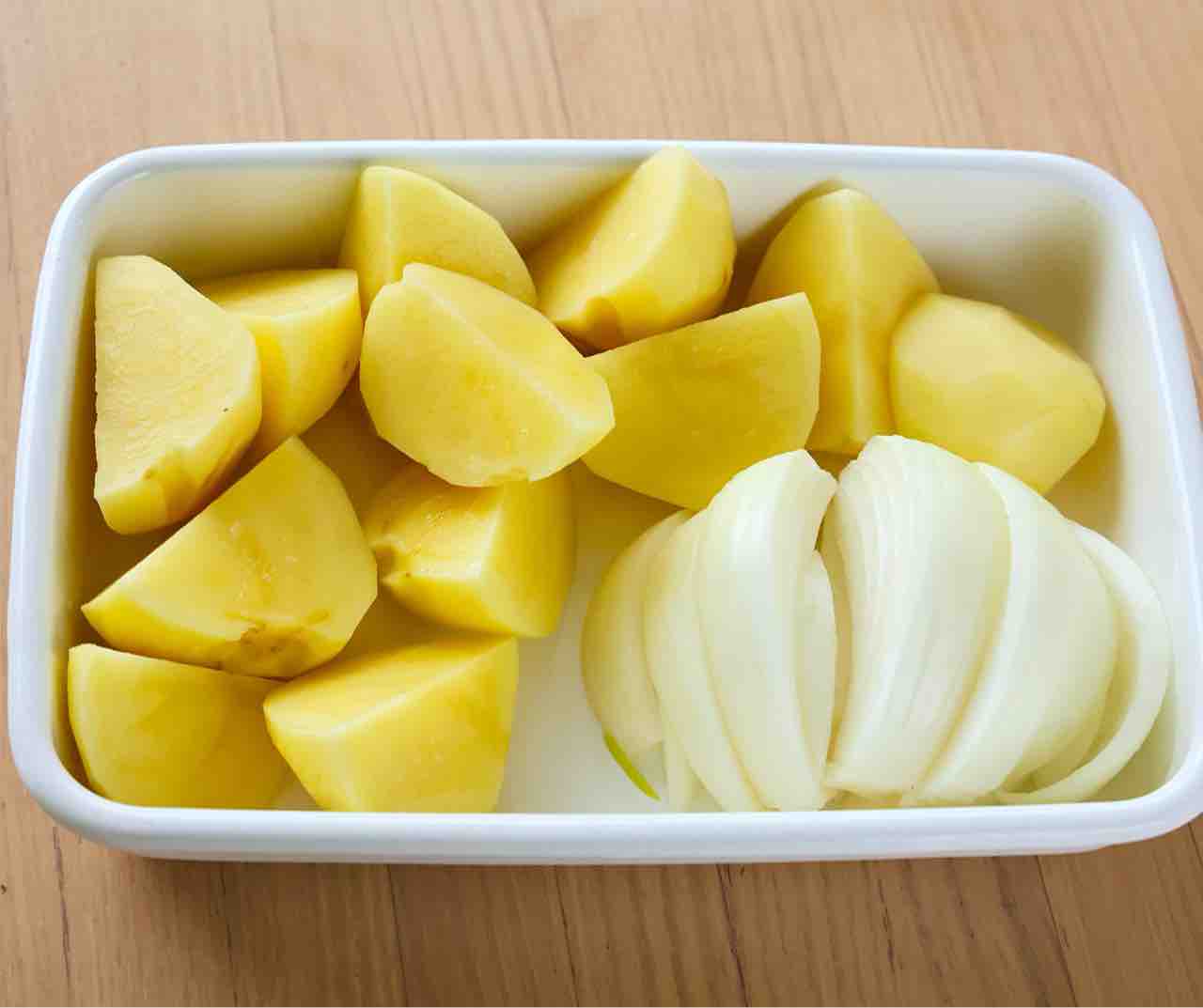 1.じゃがいもは4cm大に切る。玉ねぎは1cm幅に切る。