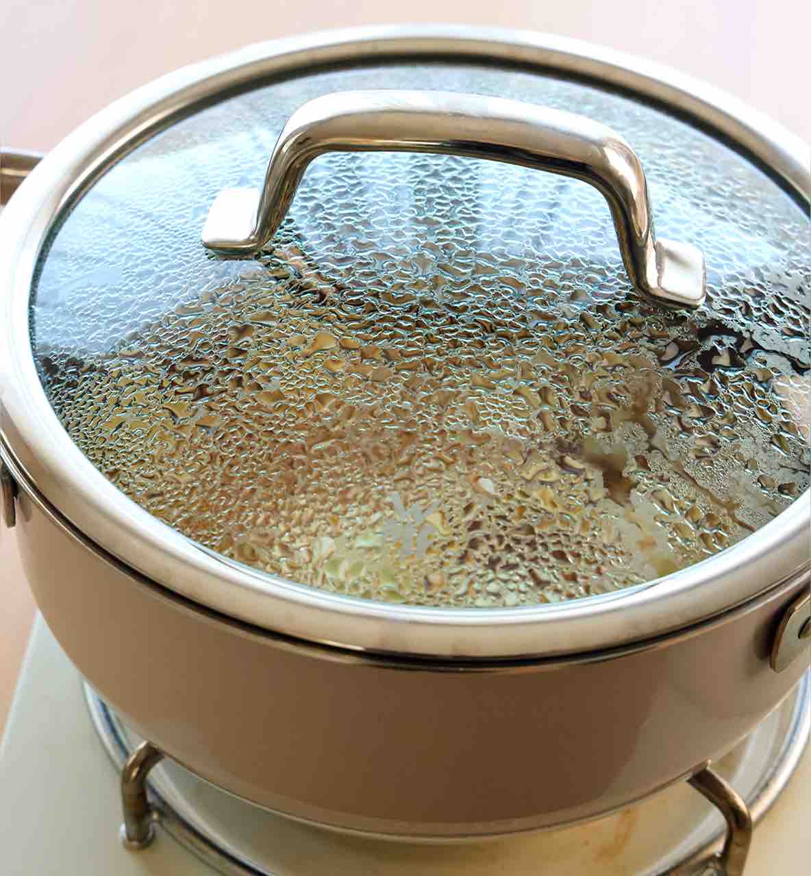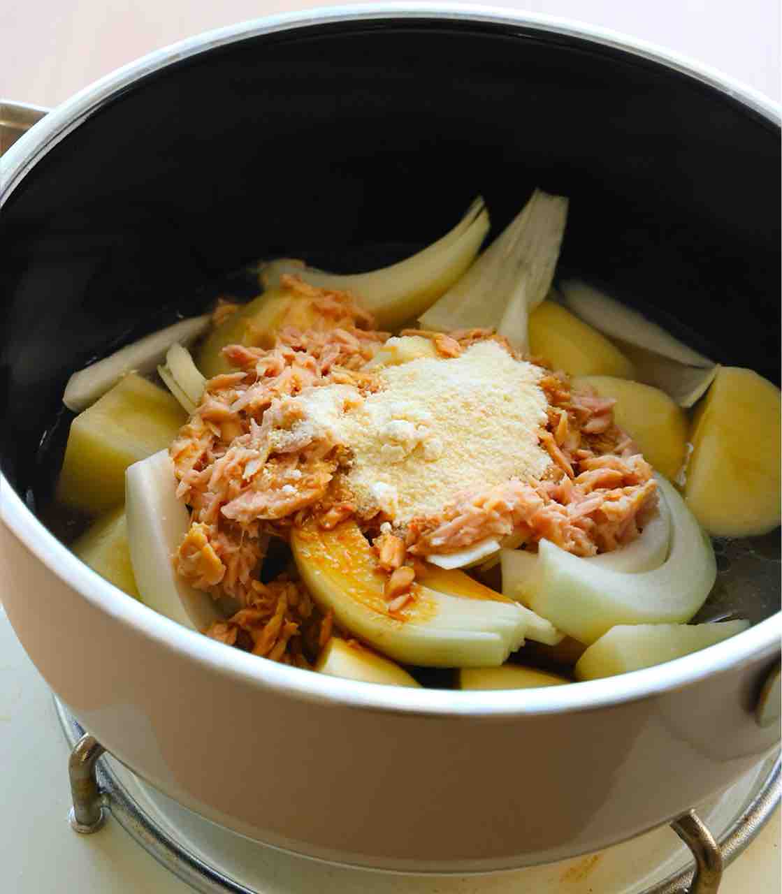2.鍋にねぎ以外の全ての材料(ツナは油ごと)を入れてざっと混ぜ、中火にかける。煮立ったら蓋をのせ、弱めの中火で13分煮る。
