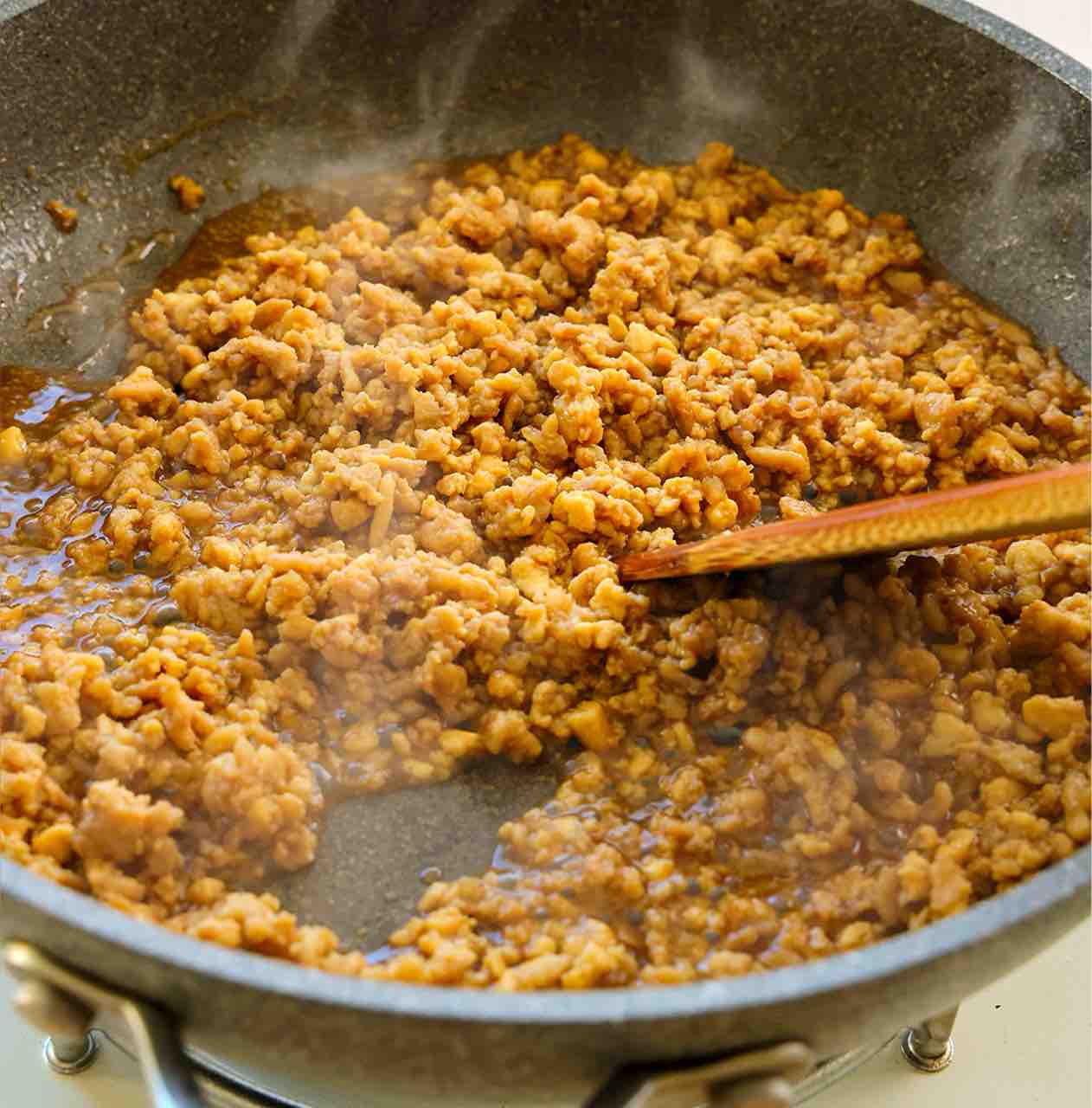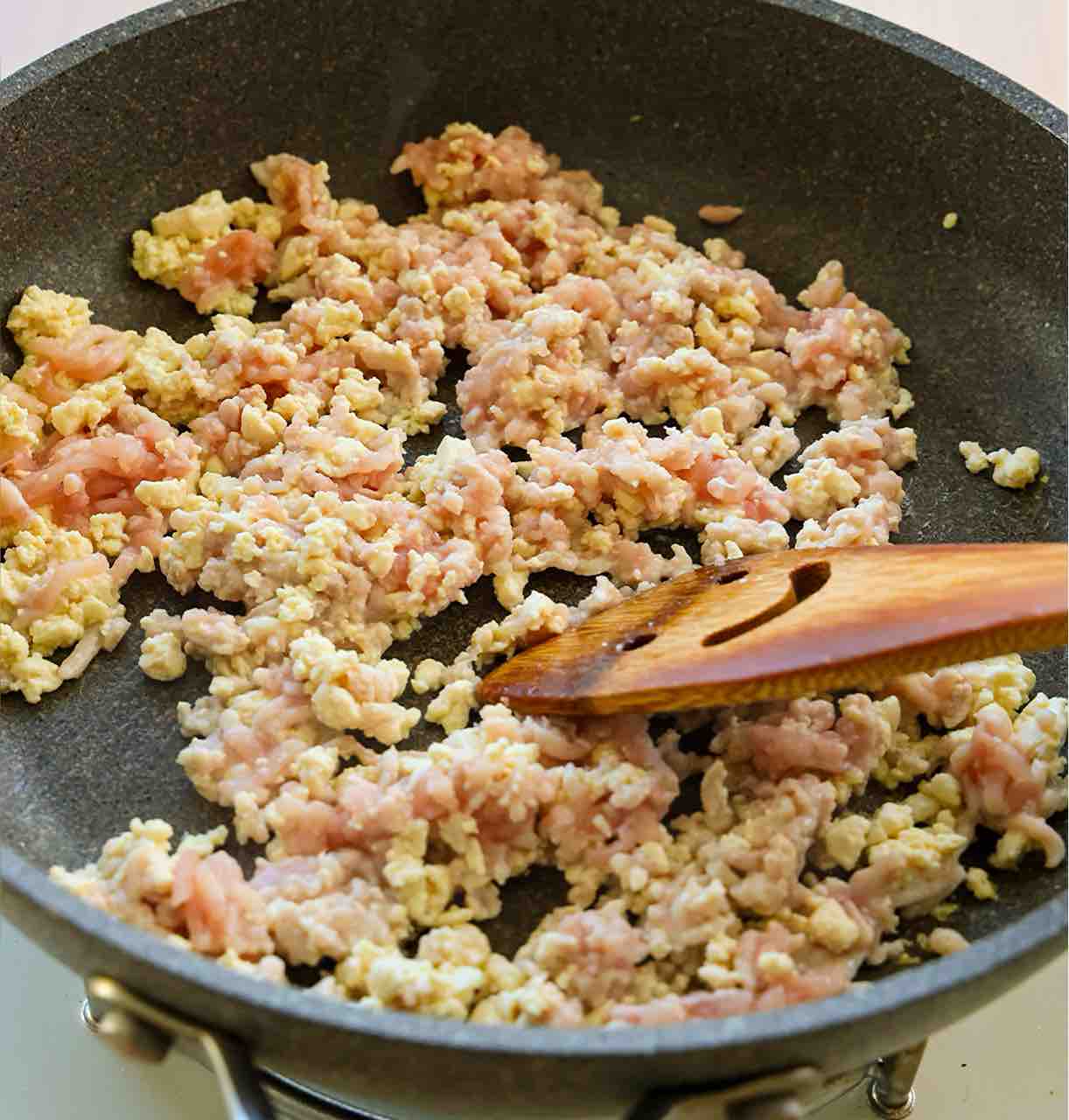 1.フライパンを中火で熱し、豆腐を木べらで崩しながらポロポロになるまで炒める。水分が飛んだらひき肉を加えて更に炒める。