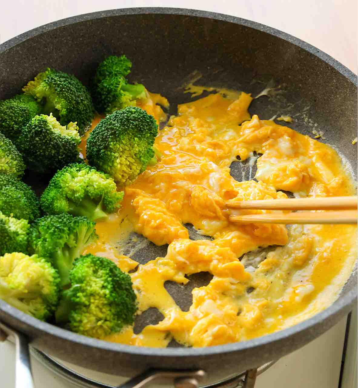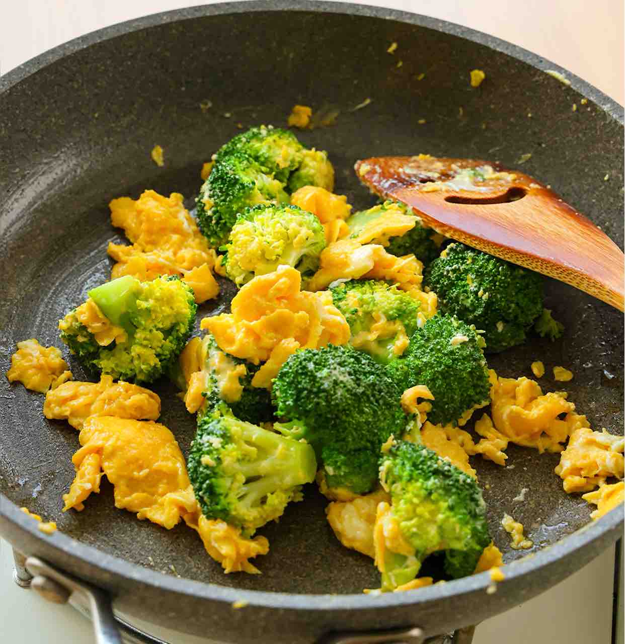 3.ブロッコリーを端に寄せ、空いたところに油を熱し、1の卵液を入れて混ぜる。半熟状になったら火を止め、マヨネーズを加えて全体をざっくり混ぜる。